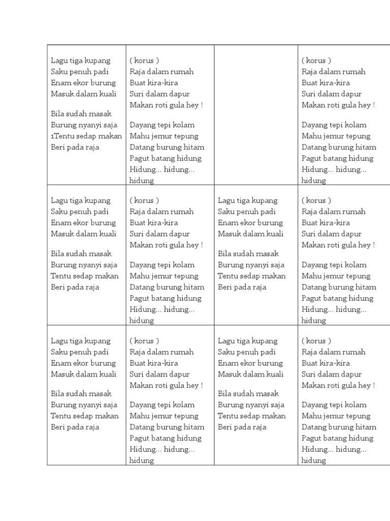 G masuk dalam kuali bila sudah masak burung nyanyi saja tentu. C lagu tiga kupang saku penuh padi g c enam ekor burung masuk dalam kuali c bila sudah masak burung nyanyi saja g c tentu sedap makan beri pada raja f c. Lagu tiga kupang sagu penuh padi enam ekor burung masuk dalam kuali bila sudah masak burung nyanyi saja tentu sedap makan beri pada raja.