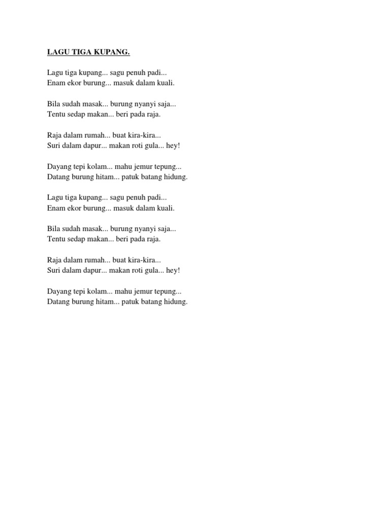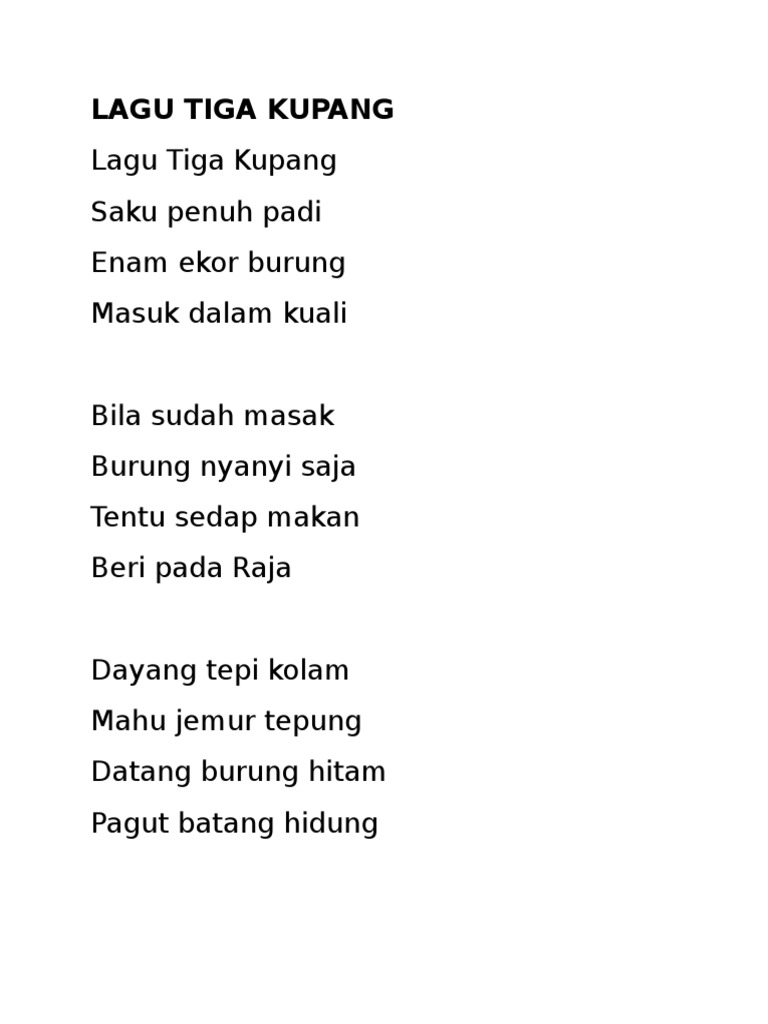 Lagu tiga kupang Saku penuh padi Enam ekor burung Masuk dalam kuali Bila sudah masak Burung nyanyi saja Tentu sedap makan Beri pada raja korus Raja dalam rumah. Give them to the king. Lirik lagu tiga kupang lagu tiga kupang.